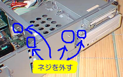 いろいろと見て、ドライブベイを止めているネジと、ケースの真ん中のフレームを外さないといけないことがわかりました。